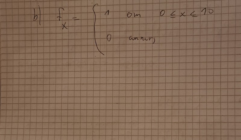 Vad menar du? Jag rättade till och fick f_x={ 1/10 0<x<10 0 , annars}.
