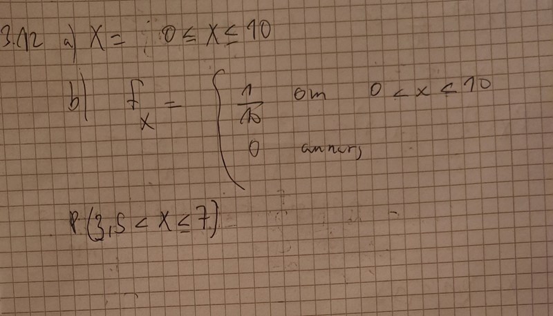 Men jag förstår inte varför ändpunkterna inte är med. Ib) uppgiften ska jag räkna P(3.5<X<=7). Hur gör man det? I facit är det så att vi X kan anta [0,10) medan jag fick fram [0,10].