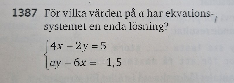 Förstår inte hur man löser dessa typ av uppgifter. Har testat att bryta ut och sätta in Y den andra ekvationen. Men ser inget sätt att ta reda på vilket värde a skulle ha.
