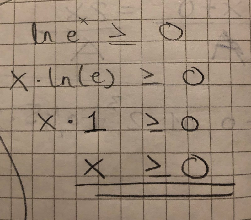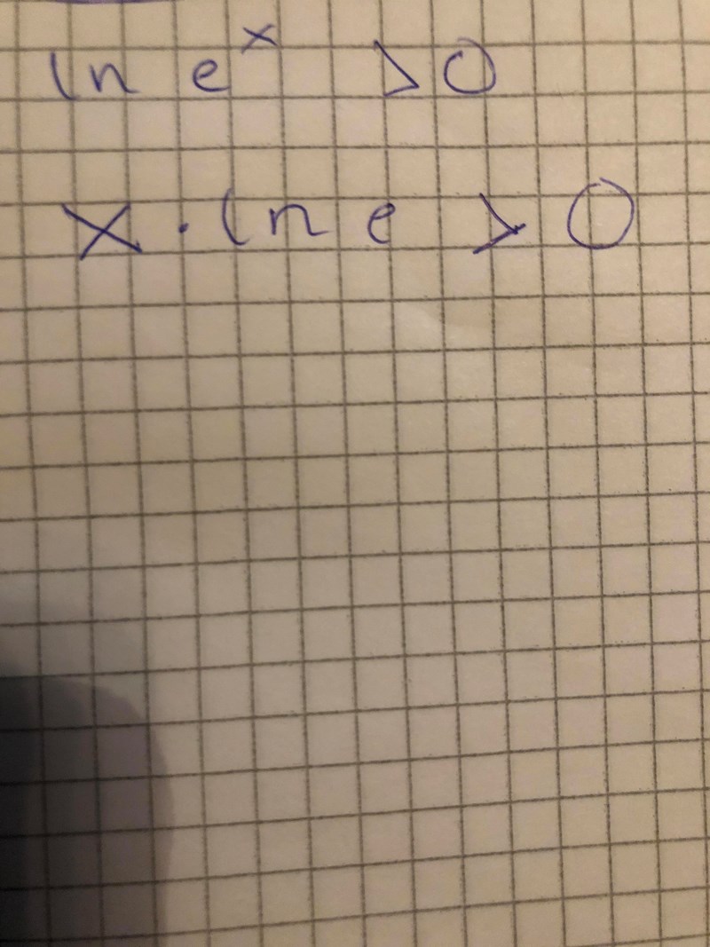 ln (e^x) > 0 stämmer, men inte nästa rad. Vad kan du förenkla ln(e^x) till?