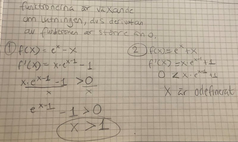 Frågan jag ska besvara lyder ”För vilka värden på x är funktionerna f(x)=(e^x)-x och f(x)=(e^x)+x växande?”