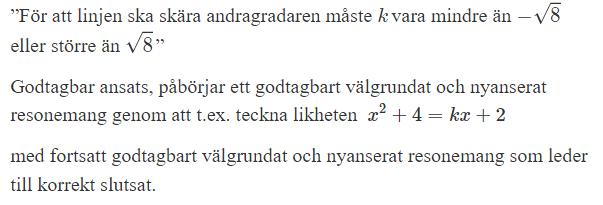 AndersW skrev:Du tar inte hänsyn till att de kan sakna skärningspunkter, så är det när du sätter upp k2/4 -2 = 0. Du borde sätta att det skall vara >0 för att det skall finnas två lösningar. Om det är < 0 saknas lösningar, dvs de skär inte varandra alls.