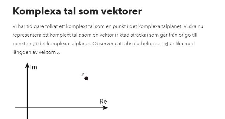 Yngve skrev:Om du känner till hur vektorer fungerar så tycker jag att du ska använda det begreppet istället för räta linjens ekvation y = kx+m för att förstå komplexa tal