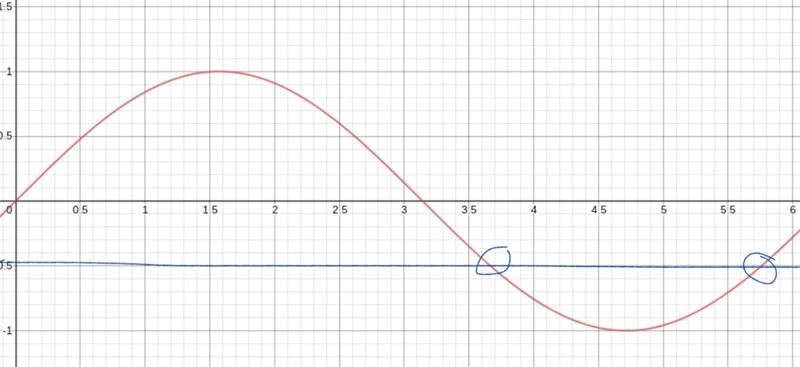 Jag gjorde på desmos och fick nu som dig :) Dessa skärningspunkter får jag fram men hur utnyttjar jag de för att få fram vinkeln? Som jag har uppfattat det visar x-axeln på sinuskurvan grader men de x-värden som framgår i skärningspunkterna är inte korrekt enligt facit.