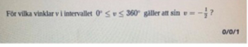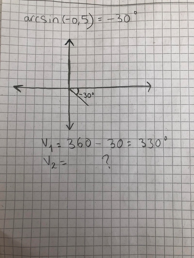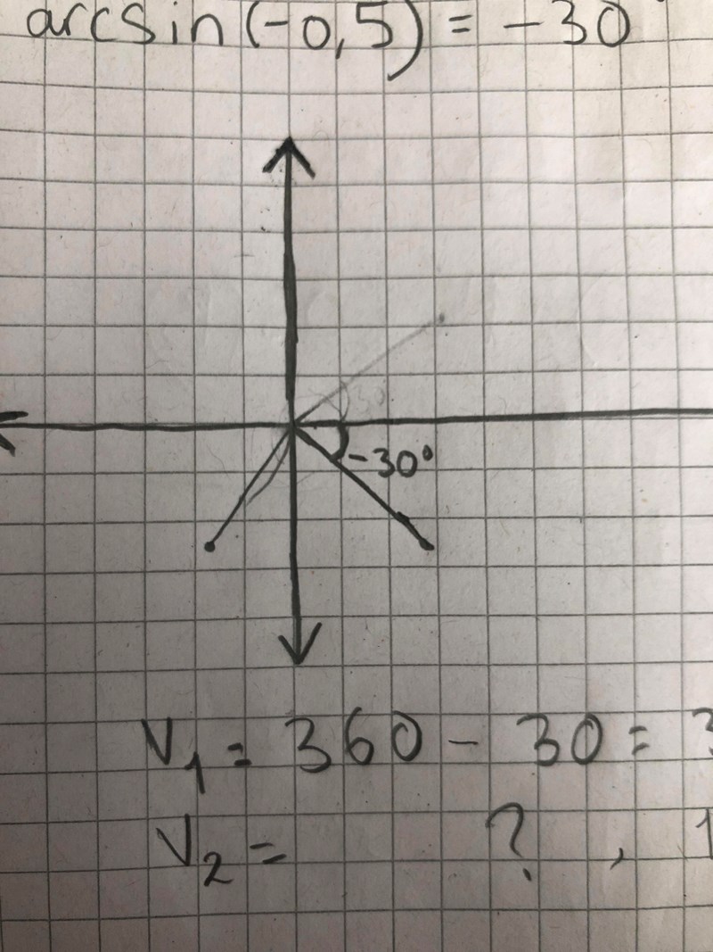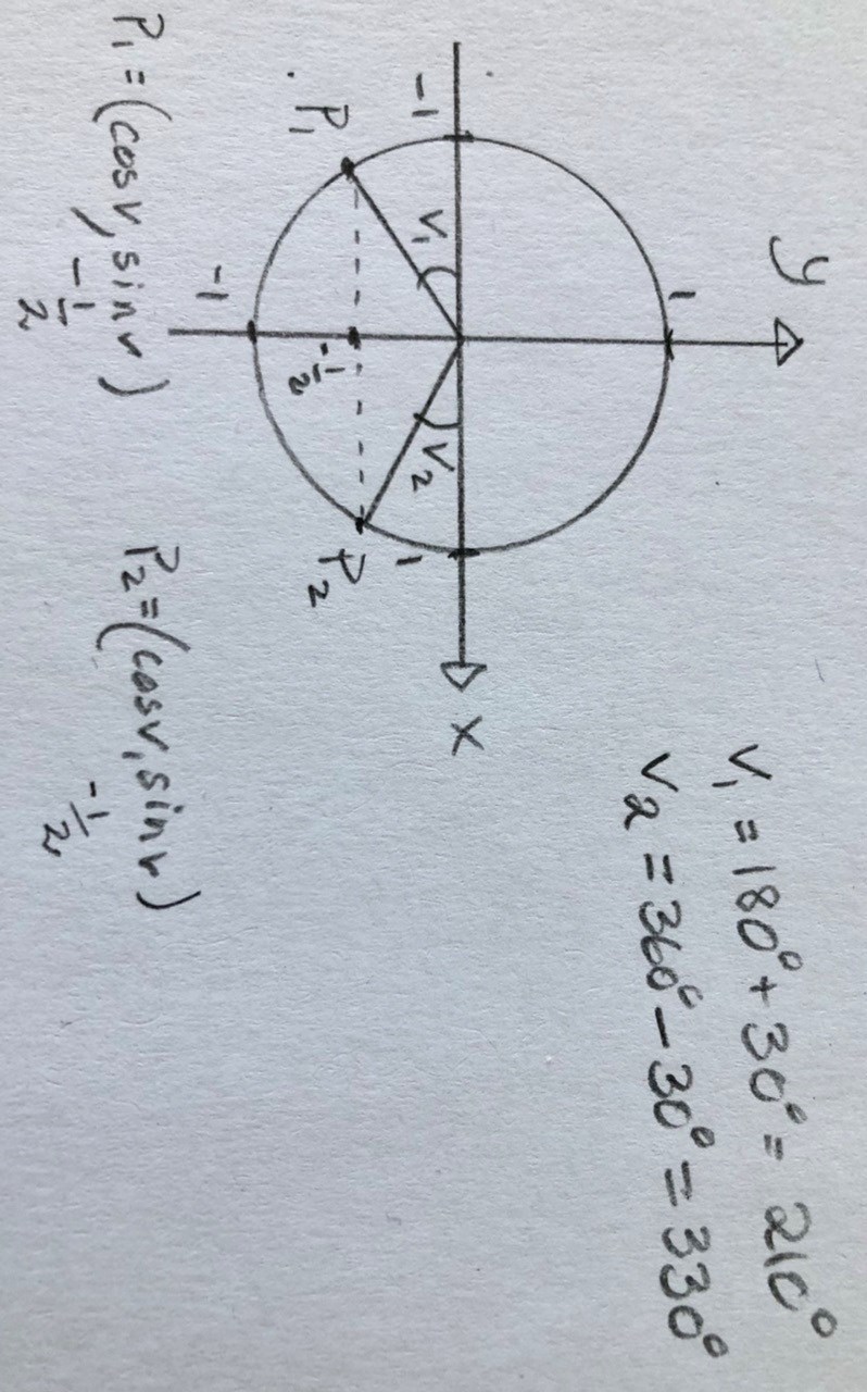 Om du vrider 30 grader nedåt från positiva x-axeln för att sin v ska bli lika med -1/2 så måste vinkeln vridas 30 grader från negativa x-axeln för att sin v ska bli -1/2. Om vi startar varvet vid positiva x-axeln och vrider varvat motsols, så är vinkeln 0 grader vid start. När vi gått 1/4- dels varv är vi rakt upp där y=1 och x=0 så har vinkeln vridits 90 grader. Fortsätter vi 90 grader till så kommer vi till y=0 och x=-1 som är en total vridning på 180 grader och vi befinner oss på negativa x-axeln. Därav 180 grader plus 30 grader.