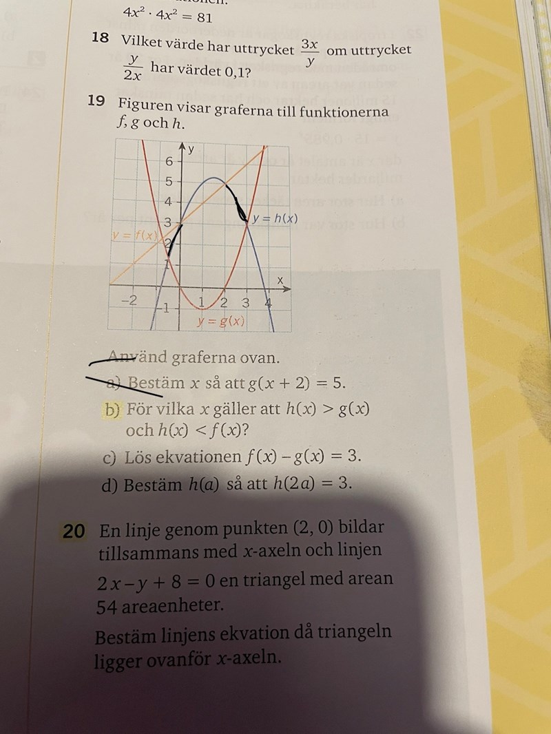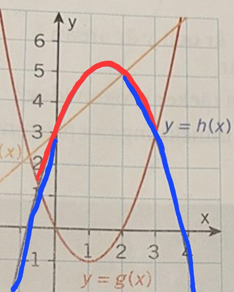 - Markera med färgpenna den del av grafen till y = h(x) som uppfyller villkoret h(x) > g(x).