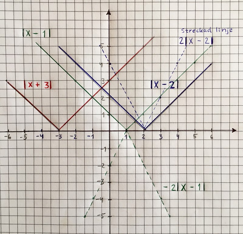 Annars kan du använda graferna, dels för att lättare kunna dela upp problemet i mindre delar (olika intervall för x), dels för att verifiera de lösningar du kommer fram till algebraiskt.