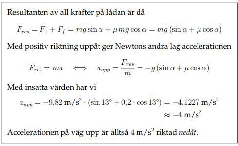vinkeln 13◦ med horisontalplanet. Friktionskoefficienten är 0,2