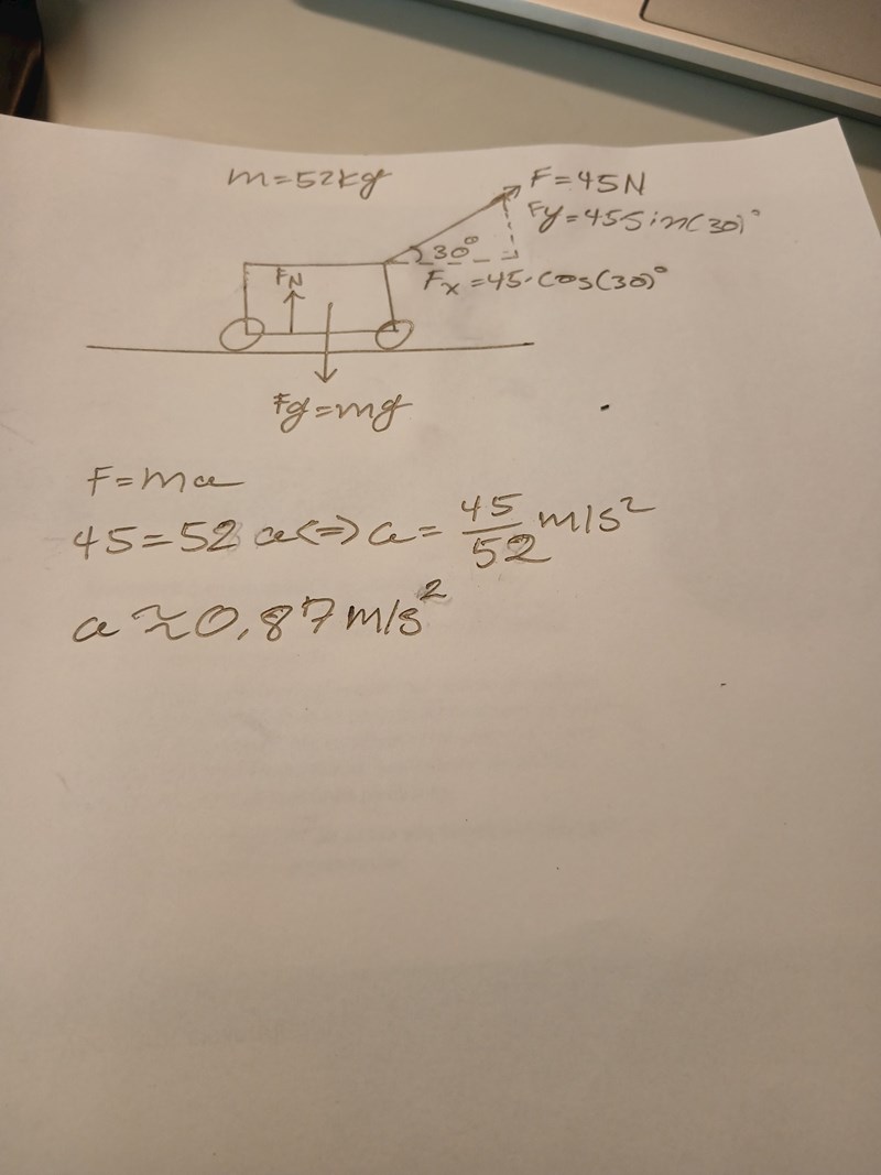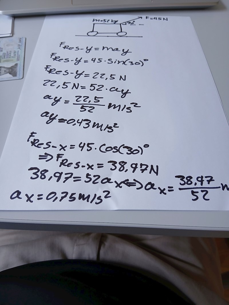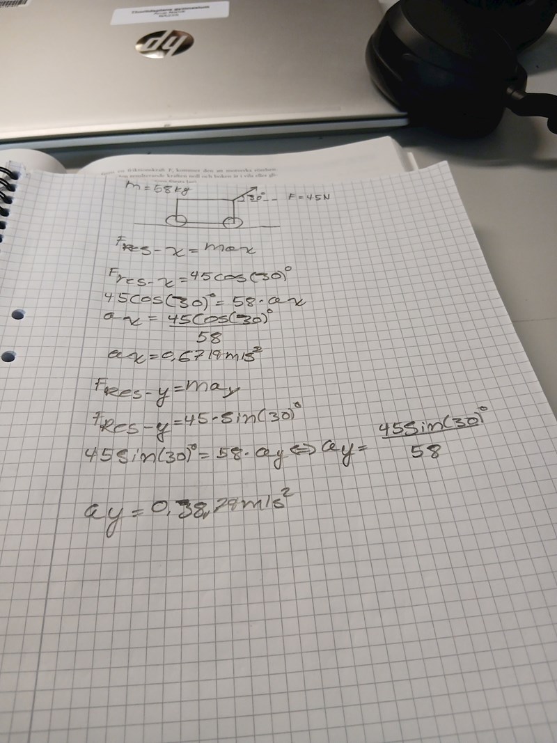 Eftersom den enda kraften som har en horisontell komposant är dragkraften F så blir den resulterande kraften i x-led Fx-res = 45*cos(30°) Fx-res = 45*sin(30°), där vi väljer att positiv riktning är åt höger i bilden.