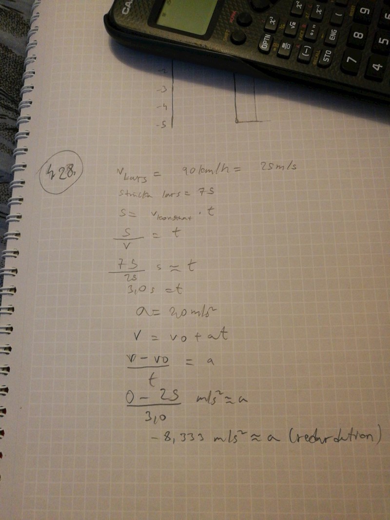 Du får tänka på att han har acceleration med 2.0 m/s2 och att han kör 90 km/h. Du vill också räkna hur långt tid han har till kollosionen. Sedan ska du räkna hur hög reterdationen ska vara så att hastigheten minskar till 0.