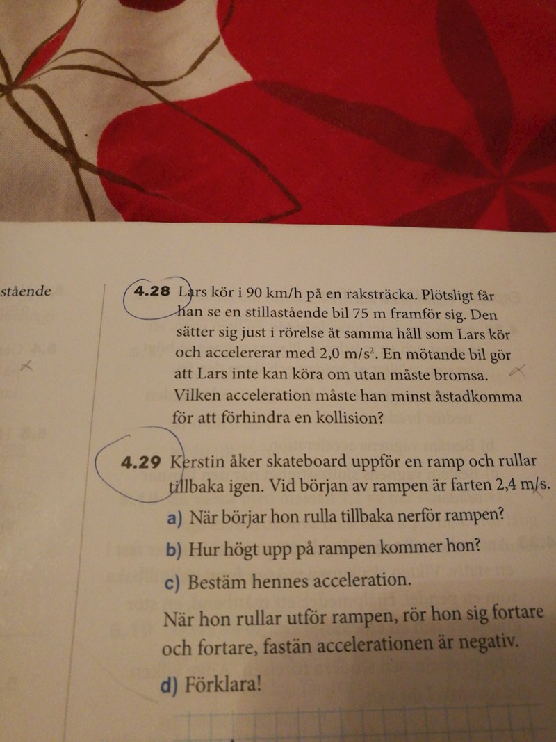 Ja bilen (som stodd still) har börjat röra på sig med acceleration 2.0 m/s2 och Lars kör med hastigeten 90 km/h så du vill först räkna hur hög hans reterdation ska vara och för att göra det så behöver du veta hur mycket tid det ska ta Lars att åka 75 m när han kör 90 km/h. när du har gjort det så ska du räkna ut hur mycket bilen har rört på sig efter samma antal tid och sen lösa uppgiften helt.