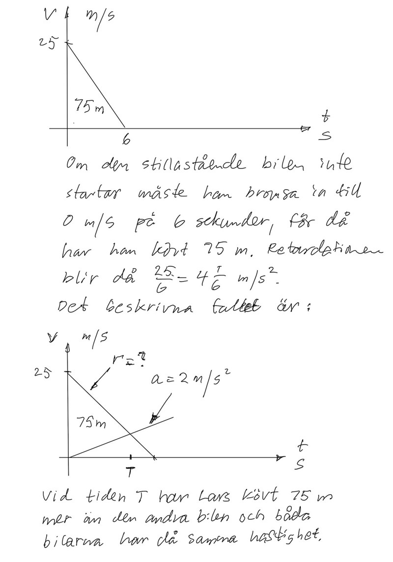 Då den andra bilen har konstant acceleration på a = 2 m/s2 så räcker det att Lars retardation är
