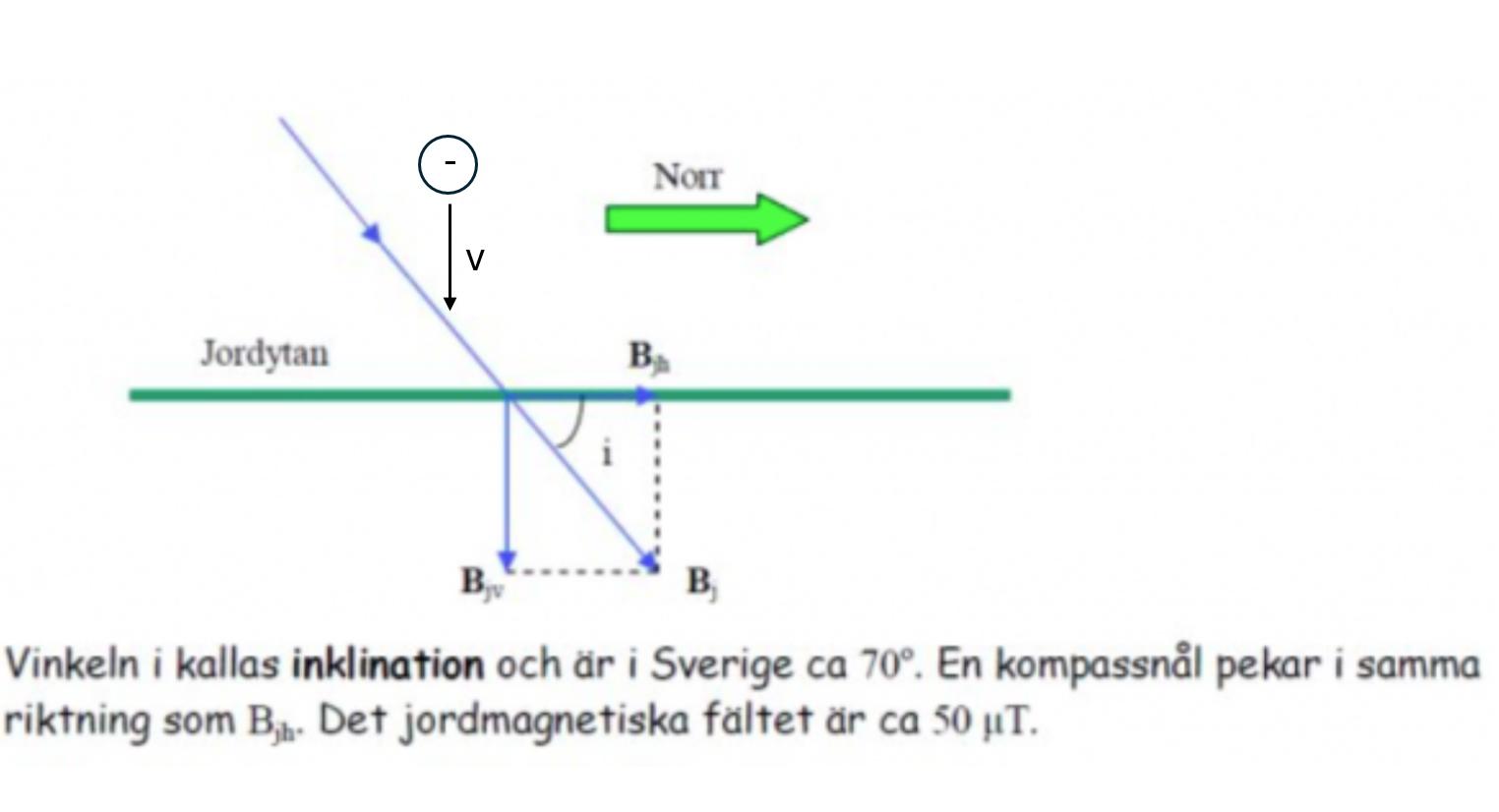Rita en figur med den fallande staven, och riktningen på det jordmagnetiska fältet. Rita in en elektron i staven och undersök med högerhandsregeln hur den magnetiska kraften på elektronen förskjuter elektronen.