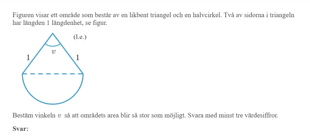 (1*1*sin v) / 2 och basen "x" kan skrivas om med cosinussatsen i termer av v: x^2 = 1^2 + 1^2 - 2*1*1*cos v. Jag ersätter detta i arean för min halvcirkel: pi*(2-2cosv) / 2, adderar ihop allt för total area och skriver in i min räknare. Jag letar efter maxvärdet och läser av vilket värde v bör ha. Får det till 170,95 grader.