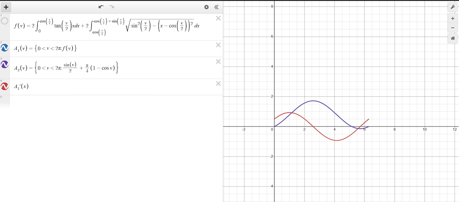 Lekte runt lite med detta. Skapade denna figur som två funktioner i geogebra. Tyvärr är arean lite laggig när man ändrar vinkeln. Borde nog skapat detta i desmos istället.