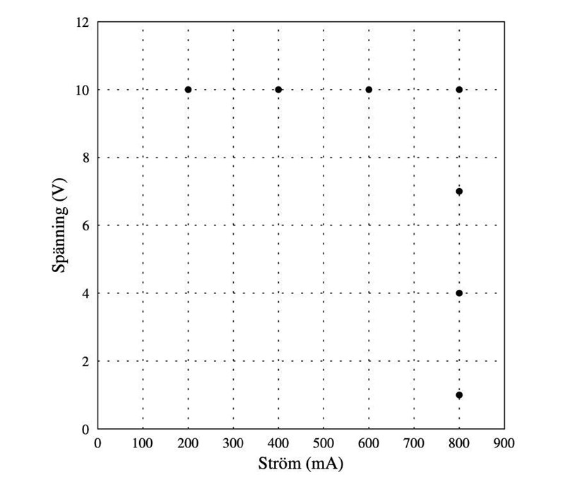 När solen lyser på en solcell fungerar den som ett batteri. En solcell med arean 0,050 m2 kopplas till 7 olika motstånd och man mäter strömmen och spänningen genom kretsen för varje motstånd. Uppmätta värden på U och I vid instrålningen 700 W/m2 finns i grafen.