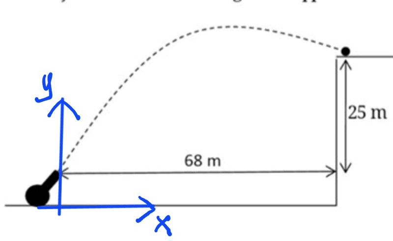 I min figur ritade jag den koordinatsystem vid kanonen och ej vid origo som du gjorde. Men det påminner mig om att vara pigg för uppgifter och ha ork att göra dem korrekt. (Det var en annan situation när jag satt med den frågan).