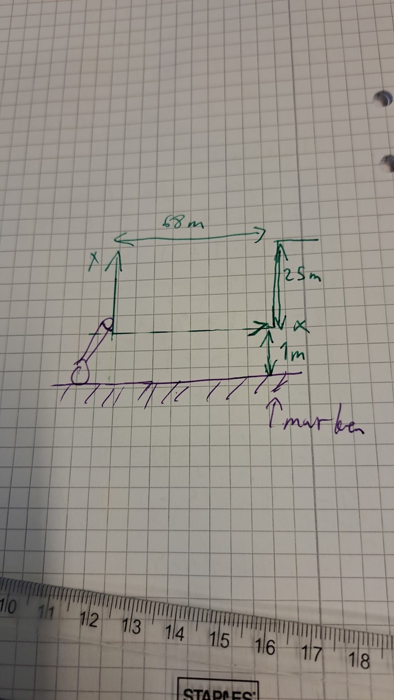 Jag kan ej utläsa från din figur var y=1 ligger på ditt koordinatsystem. Menar du att för x=68 m så blir det över y=26 m ? Om ej,varför blir y över 26 m och ej över 25m?