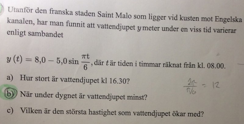 Janne491 skrev:Du har tänkt helt rätt. Men i c frågar man ju inte om vid vilken tid. Ökningen är som störst när cos(πt/6) = -1.