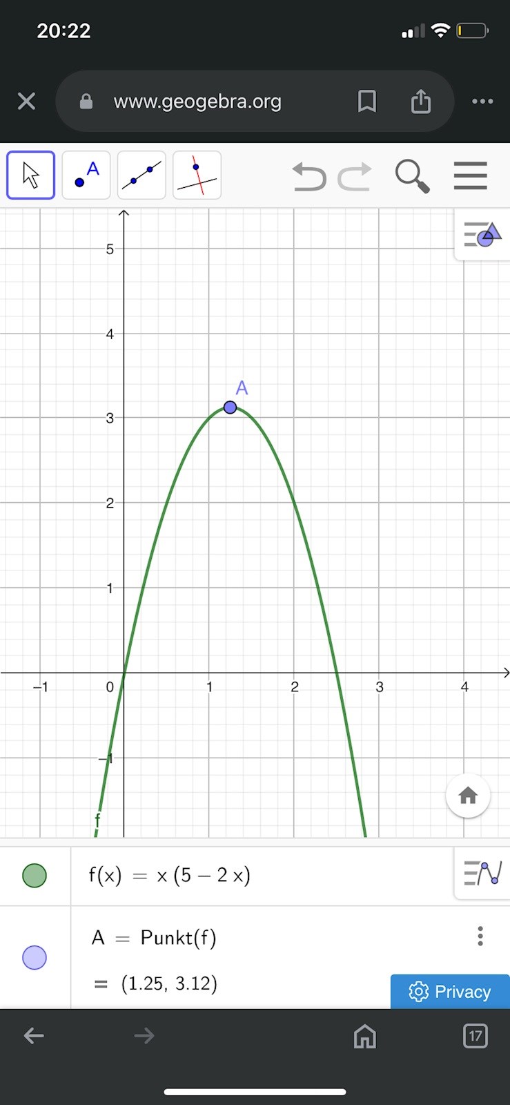 Arean av rektangeln ges alltså av basen gånger höjden. Här motsvarar det värdet på x-axeln=x gånger värdet på y-axeln=5-2x. Sammantaget får vi en funktion A(x)=x(5-2x) som ger en area beroende på x-värde. Om du tittar noga ser du att detta är en andragradsfunktion som har en maximipunkt någonstans. Din uppgift är att hitta denna punkt. Vet du hur du gör detta?
