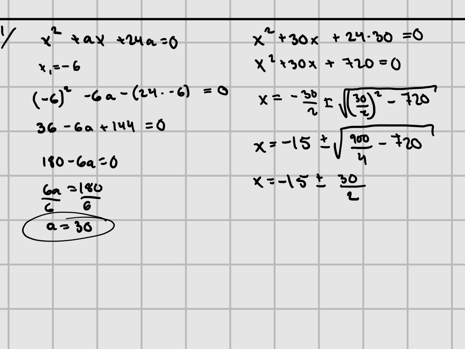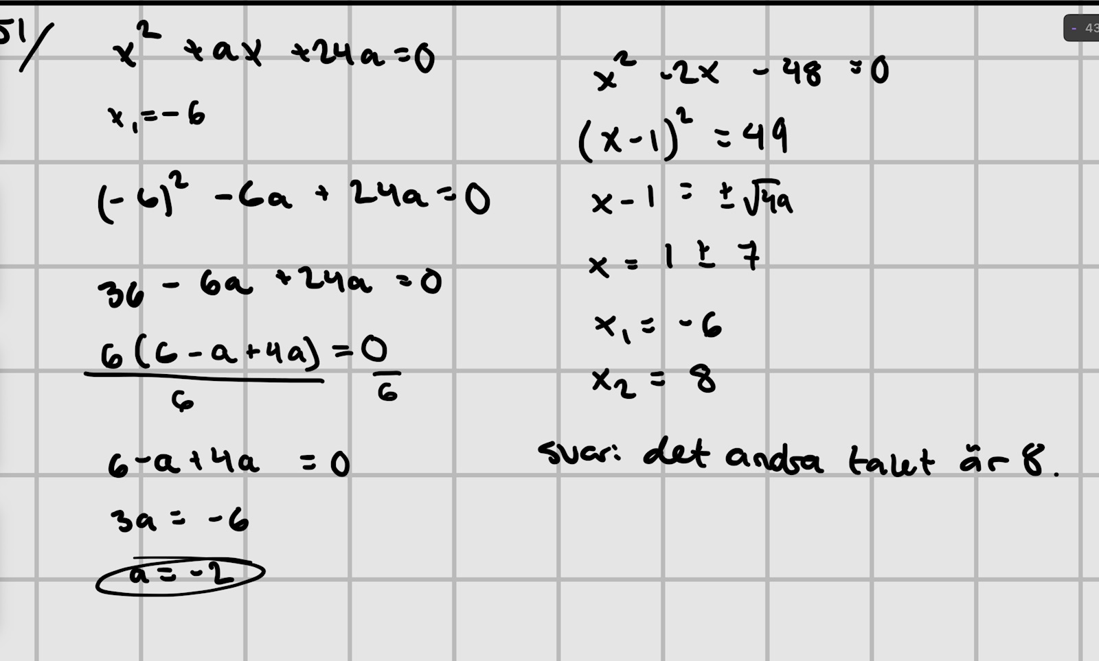 JAg har suttit med denna uppgift ett bra tag nu, men kommer aldrig fram till något svar, jag hinner alltid komma till ett steg i uträkningen när jag inser hur gel ute jag är eftersom att jag itne får jämna rötter. Felet ligger säkerligen i att jag inte får fram rätt värde på a, jag har gjort denna uppgift så många gånger nu att jag fått allt från -6 till 24 till 30 som värde för a. Alla de verkar vara fel, jag bifogar min senaste uträkning som jag insåg var helt fel ute mot slutet.