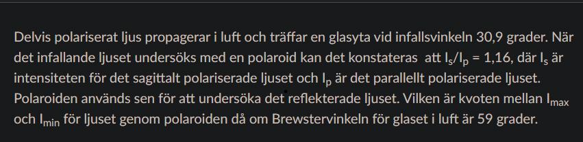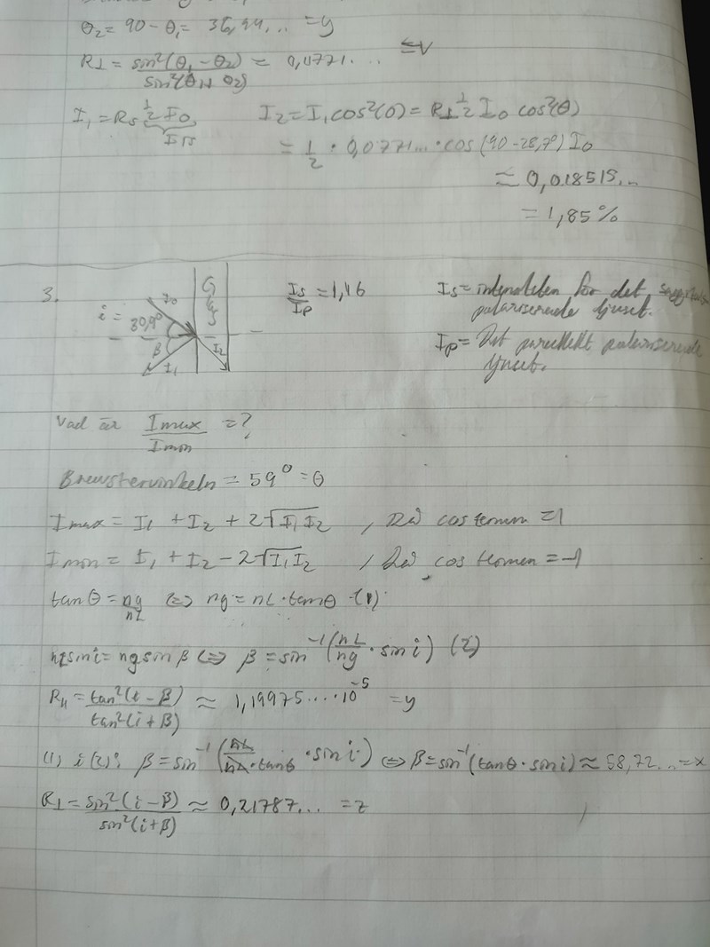 Tack för svar! Nu har jag räknat ut det reflekterade ljuset som är vinkelrätt och det som är parallelt. Jag förstår dock inte hur jag ska använda detta för att sedan räkna ut min och max? Jag är lite osäker på vad det exakt är jag räknar utt med fresnells lag, då det är det reflekterade ljuset jag räknat ut, menar man då intensiteten så jag nu har mitt I1 och I2?