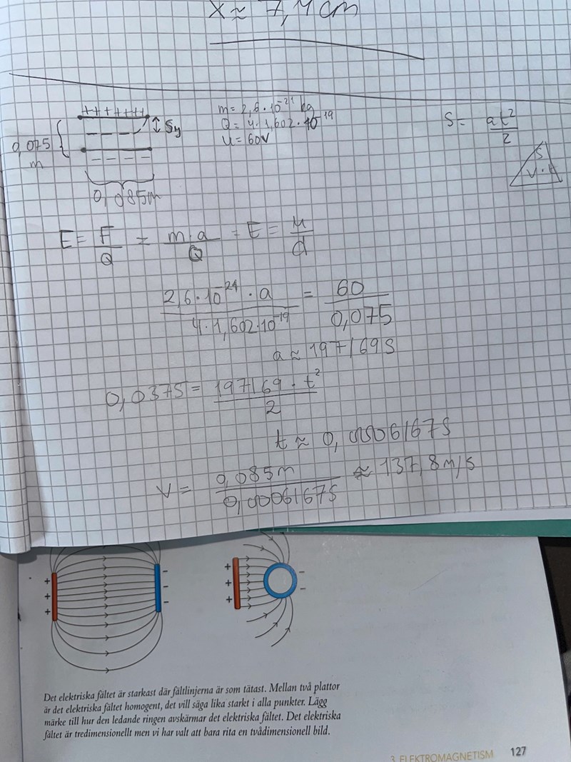 Jag ser att du konstaterat vilken maximal sträcka som partikeln kan avlänkas i y-led. Bra.