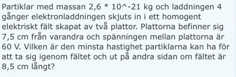 Katarina149 skrev:Varför ska man räkna med att det sker en avlänkning av partiklarna i y-led för att beräkna den minsta hastigheten?
