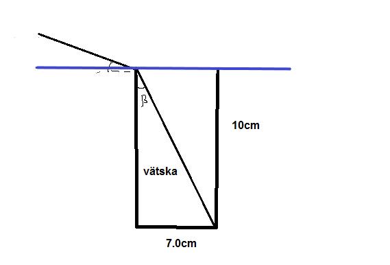 Vi ska bestämma brytningsindex för en vätska. Vi häller vätskan i ett litet kärl, som figuren vsar. Om vi rör huvudet lite upp och ner ser vi precis bakkanten på botten när vi håller ögat som figuren visar. Beräkna brytningsindex för vätskan