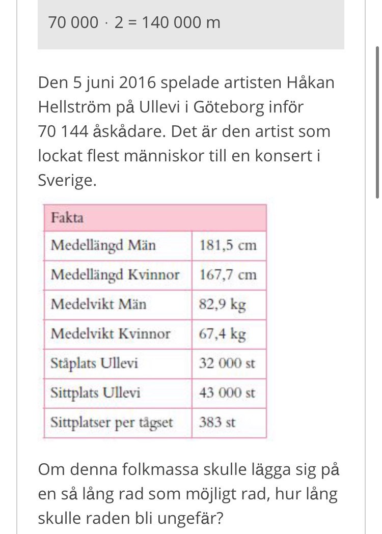 Hej! För att lösa denna uppgiften behöver vi ju veta hur många människor som var på konserten samt deras medellängd. Vi får anta att det var lika många män som kvinnor på konserten. Om medellängden för män var 181,5 cm och medellängden för kvinnor var 167.7 cm, vad var då medellängden för alla personer på arenan? Lika många var kvinnor som män