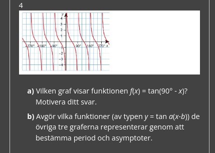 Hej, jag och facit har skrivit samma svar men på två olika sätt, så jag undrar om jag gjort rätt. Egentligen tror jag att de har kollat på asymptoten på den negativa x-axeln och jag har kollat på den positiva. Facit: tan2(45-x). Mitt svar: -tan2(45+x). Det är uppgift b,.
