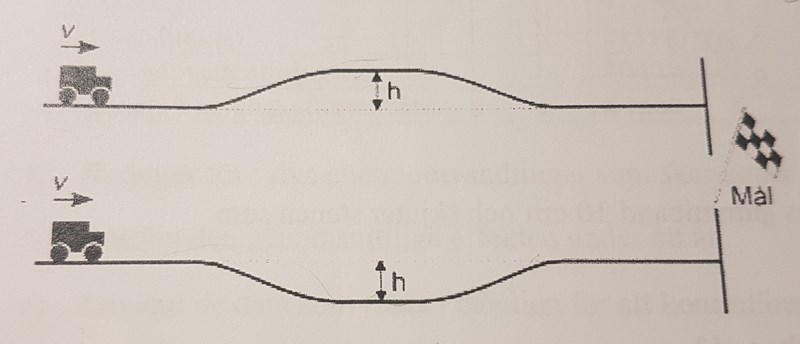 Från början har bilarna rörelseenergin . Hur ser den totala energin ut för respektive bil (på höjden respektive i sänkan)? Vad kan du därmed säga om hastigheterna?