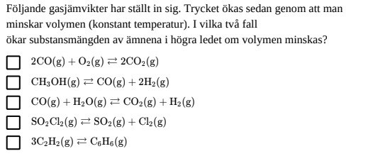 Jag tror att de ämnen som har A+B=C+D är korrekta eftersom när trycket kommer att öka så kommer A+B att reagera snabbare och mer med varandra, vilket gör att substansmängden kommer öka. Till skillnad av de reaktioner som är A=B såsom den sista så har inte den möjlighet att reagera /krocka med dem andra molekyler snabbare och mer för en ökad substansmängd.