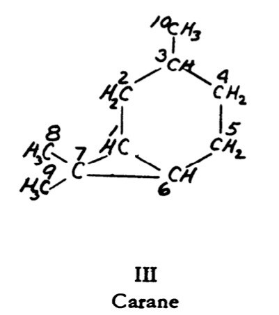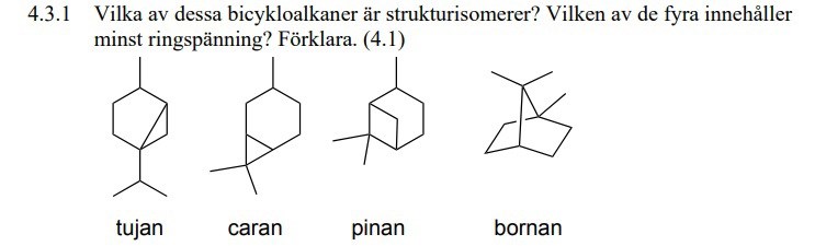 Jag vet inte riktigt hur jag ska svara på den andra frågan. Vi kan utesluta att pinan har minst ringsspänning då vi tydligt ser att vinklarna avviker från 109 grader. Vidare kan vi även utesluta bornan då vi ser att den har två ekliptiska grupper och en ''spets'' som avviker från 109 grader. Nu kommer vi till tujan och caran. Vinklarna i en cyklohexan är i regel 109 grader. I tujan bildar substituenterna en antikryssform men de gör de även i caran. Dock avviker formen från caran mer från 109 grader varför jag tror att tujan har minst ringspänning. Några tankar?