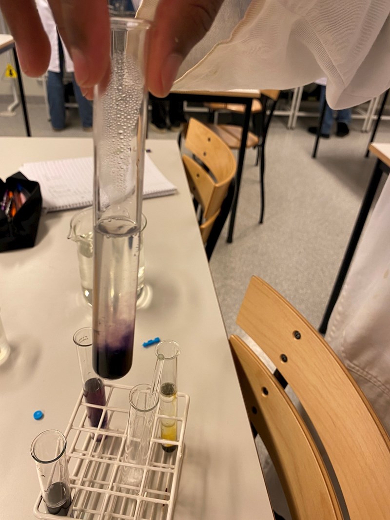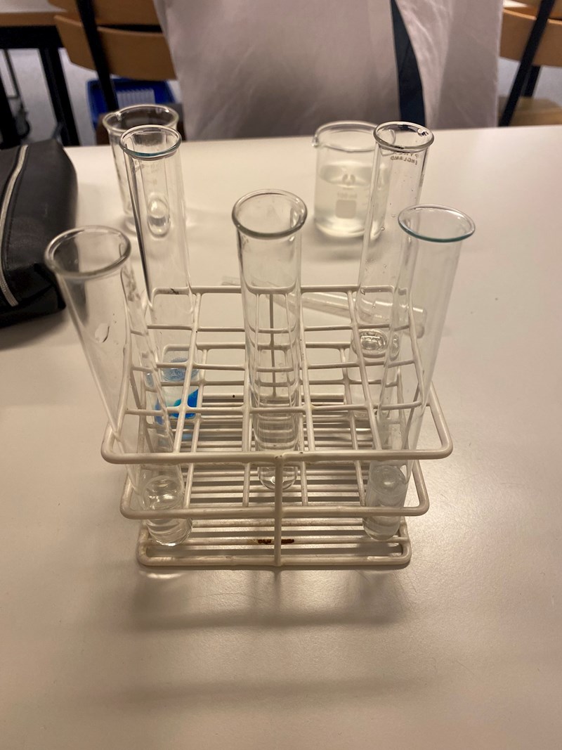 Jag vet att det översta provröret till vänster innehåller koppar och att det längst ner till vänster i provrörshållaren innehåller kokt amylas. Däremot är jag osäker på de två provrören till höger – jag vet inte vilket som innehåller stärkelse och vilket som innehåller HCl.