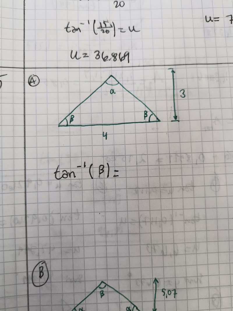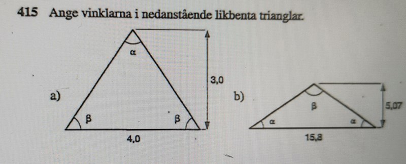 Jag vet inte riktigt hur man gör när triangeln är likbent, dvs hur ska jag veta vilken som är motstående kantet osv. Jag tror man ska använda tan^-1 men kan ha fel.