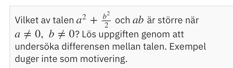 Således: Differensen mellan talen (a^2+b^2/2) och ab är alltid >0, dvs talet (a^2+b^2/2) är alltid större än ab för alla värden på a och b (då dom inte är lika med 0)