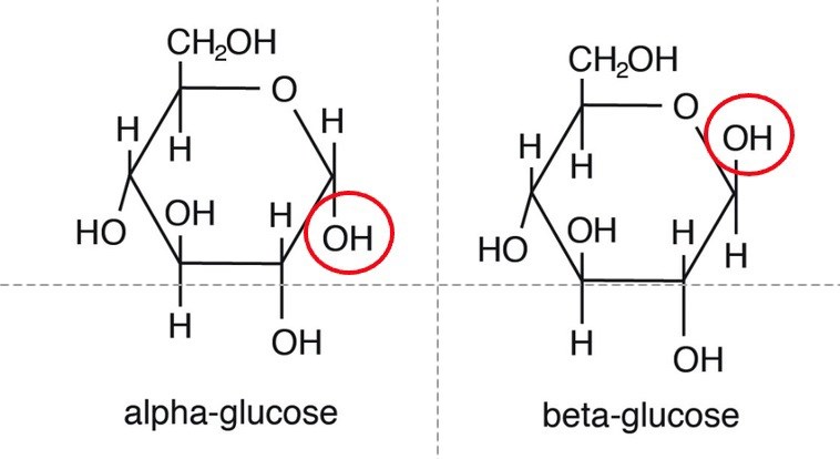 Glukos förekommer även i den raka formen (d.v.s. inte ringsluten) och när den raka formen bildar ringforman kan hydroxigruppen på kol 1 antingen hamna under ringen (peka ner), eller över ringen (peka upp) - och det är detta som avgör om det är alfa- eller beta glukos.