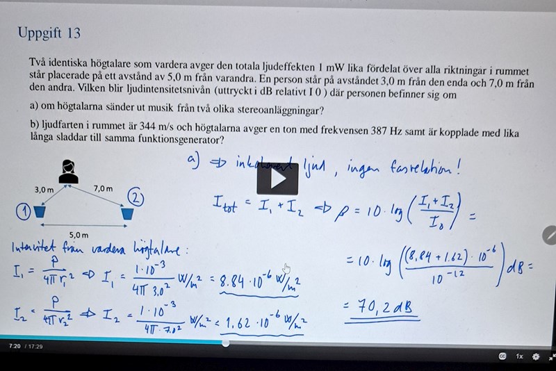 Jag förstår inte varför intensiteterna från vardera högtalare adderas medan ljudintensitetsnivå inte gör det? Jag adderade B1 från första högtalaren och B2 från andra högtalaren vilket gav mig två olika värden på ljudintensitetsnivån som sen kunde summeras. Svaret stämde inte överens med lösningen i bilden ovan. I klippet säger han även att det är en inkoherent ljud, vad betyder det?