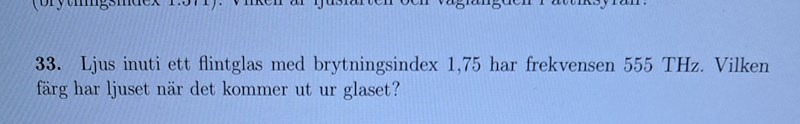 Facit fick att våglängden är 540 nm medan jag fick 309 nm. Deras motivering är att det är samma våglängd som kommer in i flintglaset som kommer ut. Hur kommer det sig att det är endast v= f*lambda man ska använda och inte lambda=c/(n*f) som jag gjorde?