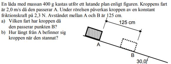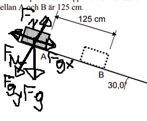 Positiv riktning väljs ned för lutande planetFgx=Fg·sin30=mgsin30Fm=friktionskraftWtot=WFgx+WFm=Fgx·s+(-Fm·s)=mgsin30·s-Fm·s=-0,42 J