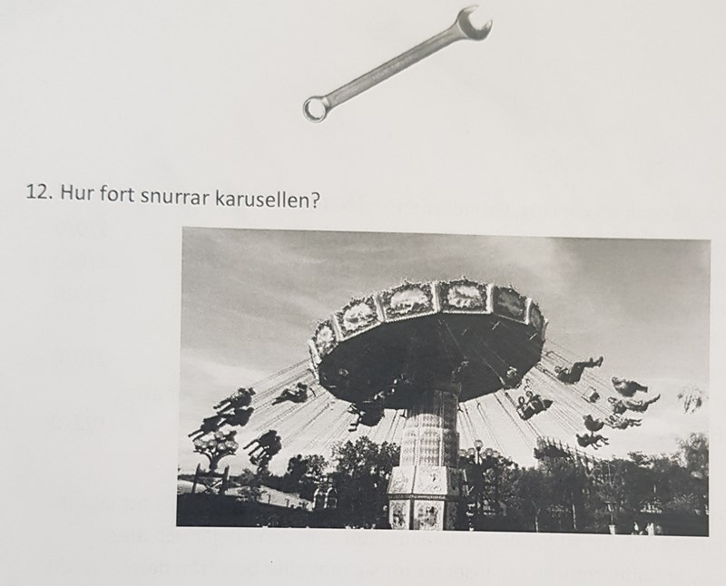 Fråga: Hur fort snurrar karusellen? (Och så är det en bild på en karusell). Jag får ingen information om massa, radie eller hur lång en period är, i frågan.