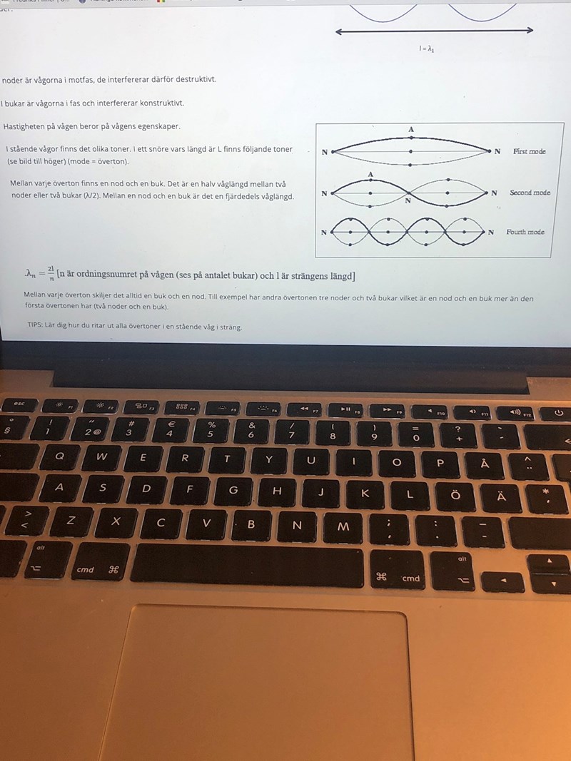 En kommentar: Fallet rvå noder och en buk vid slutet rör eller sträng kallas grundton. Fallet tre noder och två bukar kallas första övertonen.