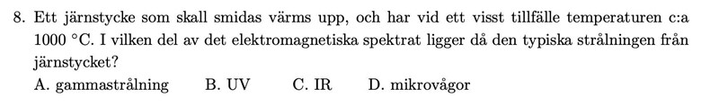 Är det så att den här frågan kommer från MaFy-provet? I så fall förväntas du nog tänka lite själv och komma på att glödande järn brukar lysa dovt rött.