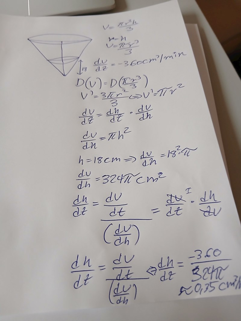 dVdt=πh2·dhdt\frac{dV}{dt}=\pi h^2\cdot\frac{dh}{dt}, dvs dhdt=dVdtπh2\frac{dh}{dt}=\frac{\frac{dV}{dt}}{\pi h^2}