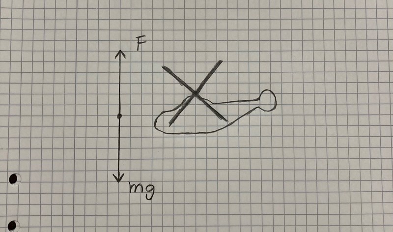 Här får jag konflikterande tankar. Först tänker jag naturligtvis att man tar reda på kraften upp genom att ta reda på vad kraften neråt är men sedan slog det mig att dessa två krafter kommer från två olika objekt. Tyngdkraften kommer från helikoptern och kraften uppåt kommer från luften som rotorn trycker ner vilket innebär två olika massor.