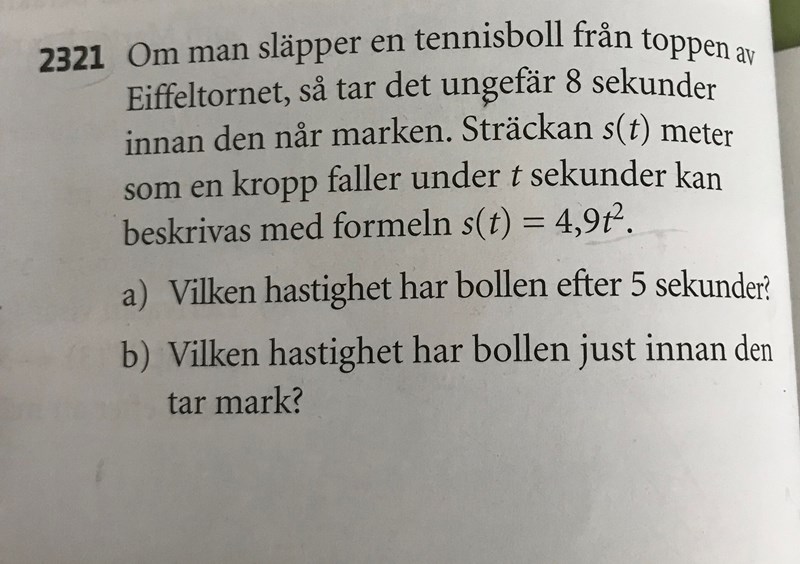JohanF skrev:Du har svarat på s(5), dvs hur långt bollen fallit efter 5 sek.