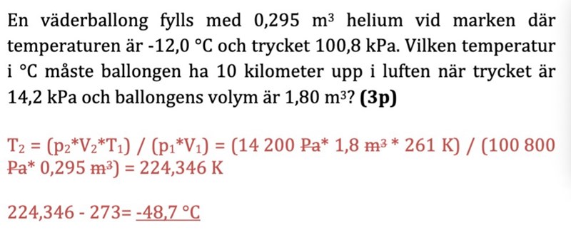 Jag förstår inte i lösningen under frågan vad T2 = (p2*V2*T1) / (p1*V1) kommer ifrån. Tanken är att det kommer från pV = nRT formeln men jag kan inte hitta något i läroboken, hjälp!