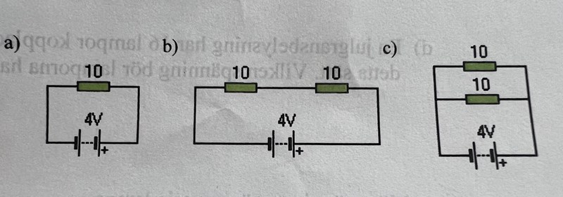 Vad jag förstått är att motstånd används för att minska strömmen i en krets. Då borde väl strömmen minskas ännu mer om fler motstånd kopplas in? Trots det drar koppling a) minst ström enligt mina beräkningar. Här är mina mätvärden: