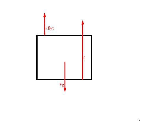 Krafterna som är riktade uppåt är den sökta kraften F och vattnets lyftkraft Flyft . Nedåt är det endast tyngdkraften Fg.